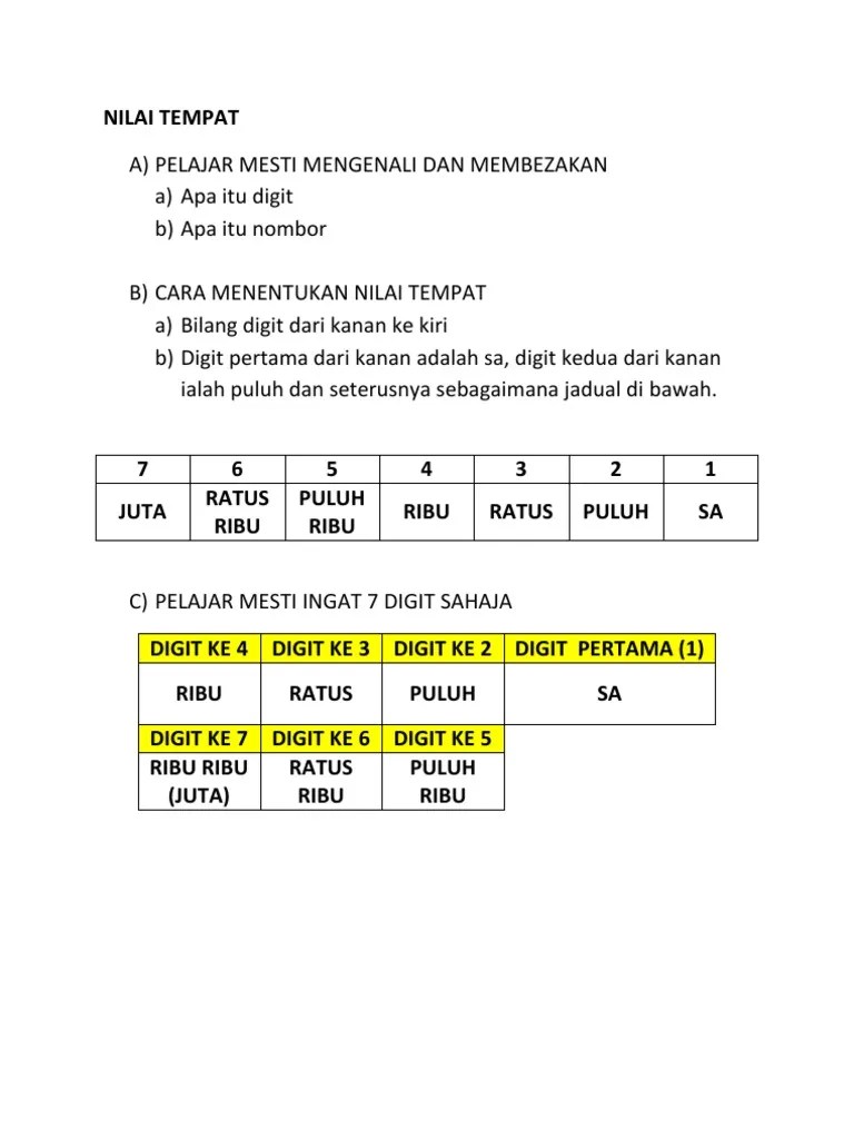 Bermula dengan mengenal nilai tempat ones/sa, tens/ puluh, hundreds / ratus dan thousands/ ribu semasa tahap 1 iaitu daripada tahun 1, .